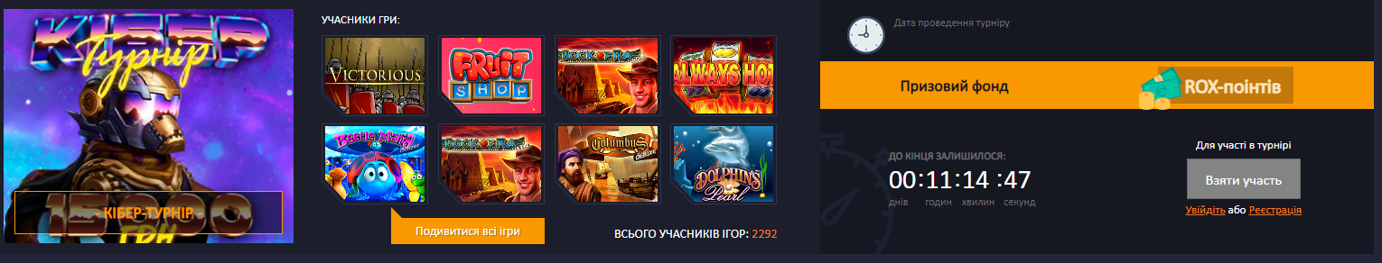 Еженедельно в казино проводятся рейтинговые соревнования на выбранных игровых автоматах. Каждая 1 ₴ ставки дает игроку 1 балл для улучшения рейтинга в турнирной таблице. По результатам недельных гонок будет определено 10 победителей. 1 место получит 8 000 ₴, второе – 6 500 ₴, третье – 5 000, последнее – 500 ₴ реальными деньгами.